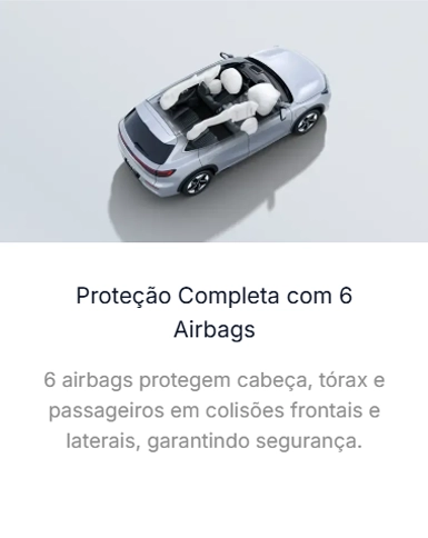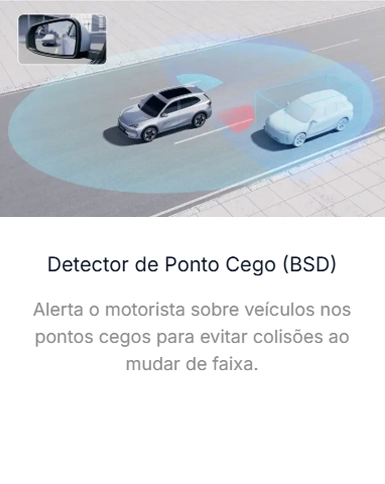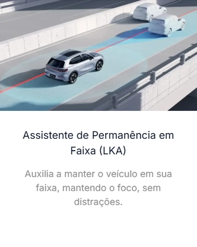 São 13 sistemas avançados de assistência ao condutor, que tornam sua direção mais segura, prática e confiante. Com o Piloto Automático Adaptativo (ACC) e o Piloto Inteligente (ICC), o carro ajusta velocidade e distância automaticamente. Já os assistentes de faixa (LKA, LCA, ELKA) mantêm o veículo centralizado e realizam mudanças com segurança. Tecnologia que trabalha por você, para uma condução mais segura todos os dias.